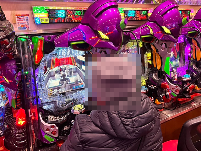 パチンコをみてみると、「新世紀エヴァンゲリオン~未来への咆哮~」に、晴れやかな表情でハンドルを握っている姿があった。