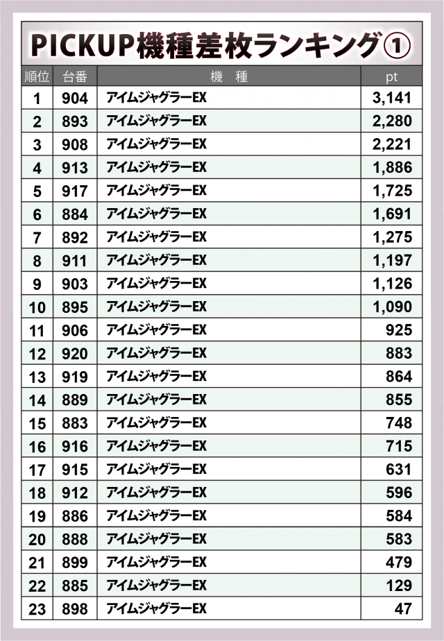 『アイムジャグ』40台は5割を超える台がプラスを収めた。904番台が+3千1百超となった上に、+2千超×2・+1千超×7と、好機が潜んでいるのが窺えた。