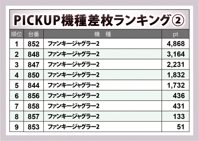 『ファンジャグ』20台は惜しくも勝利した台が半数に届かなかった。しかし、852番台が+4千9百弱と会心の一撃を放ち、+3千2百弱・+2千2百超が1台ずつ&+1千7百超が2台と、チャンスが秘められていたことが伝わってきた。