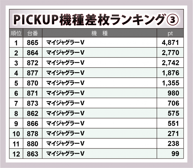 『マイジャグ』20台は半数超の台がプラスを迎え、865番台が+4千9百弱とシリーズ一番の数値を刻み、+2千7百超・+1千超が2台ずつと、上2つに負けない環境であることが感じられた。