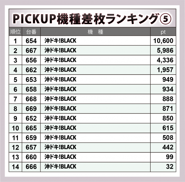 『沖ドキ!BLACK』20台は上表の通りプラス台の多さが光った。しかも654番台が+1万6百超と大台を突破したのを筆頭に+6千弱・+4千3百超・+2千弱と、他機種に対抗した。