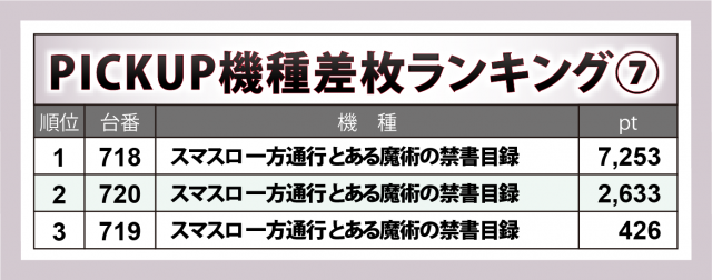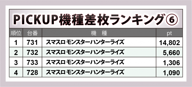『スマスロ モンスターハンターライズ』7台では4台が4桁以上のプラスをマーク。731番台が+1万4千8百超を叩き出し、他にも+5千7百弱と、価値あるコーナーだったと言えよう。