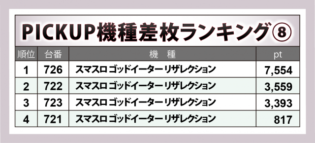 『スマスロ ゴッドイーター リザレクション』7台も過半数がプラス。+7千6百弱・+3千6百弱・+3千4百弱と、重量級の出玉がズラリ。