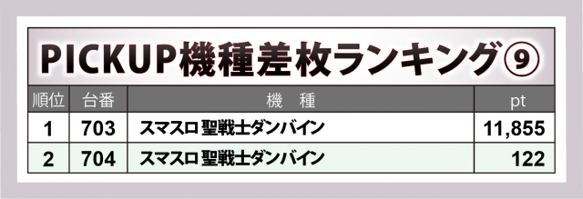 『スマスロ 聖戦士ダンバイン』4台ではピッタリ半分の2台が勝利し、703番台が+1万1千9百弱と、ホームラン級の出玉をかっ飛ばした。