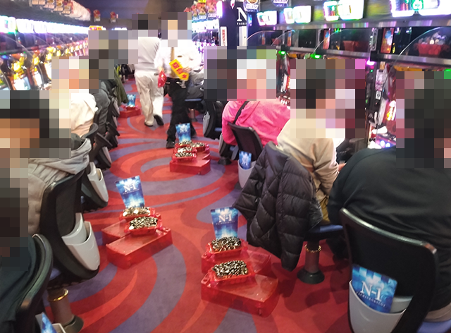 多くのプレイヤーが持ち玉を使い、笑顔で遊技をおこなっていた。