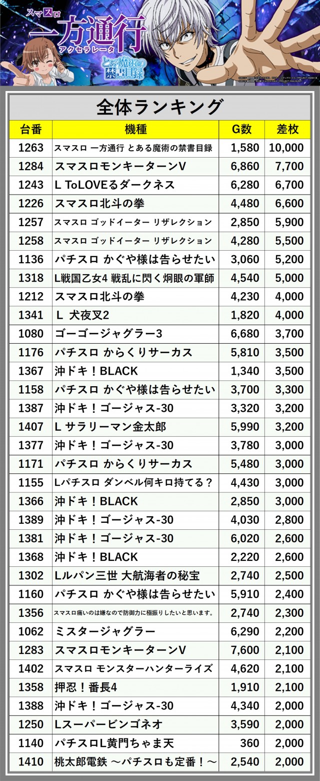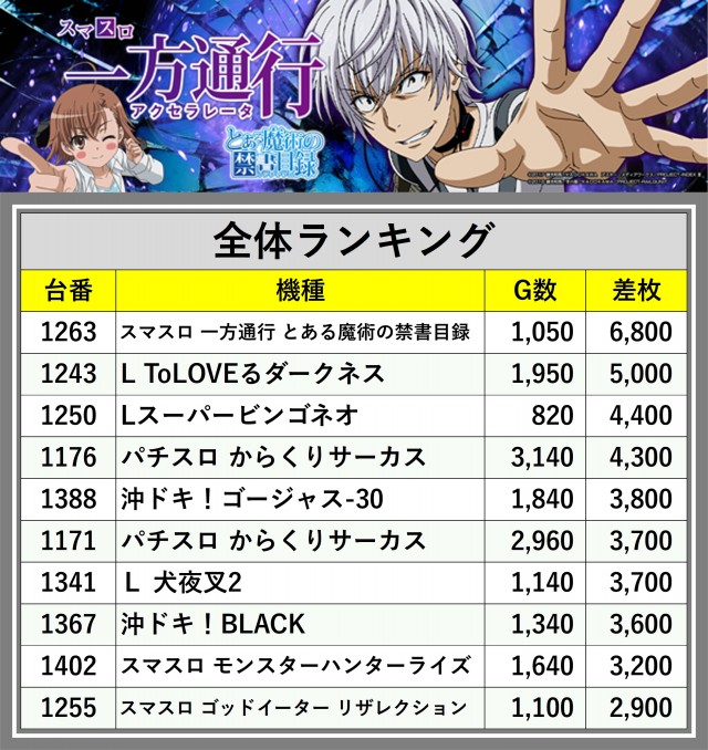 厳選された取材対象機種をはじめ、その他スロット全体から好記録が飛び出した!プレイヤーが楽しんだ1日を下記データにて振り返ってみて欲しい。