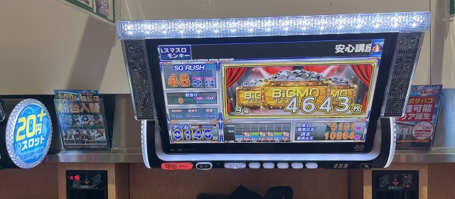 まず向かったのは[1000円/46枚] スロのシマ。スマスロコーナーの台上には多数のドル箱表示が映し出されていたが、その中で黄金のドル箱がいくつも目に付いた。
