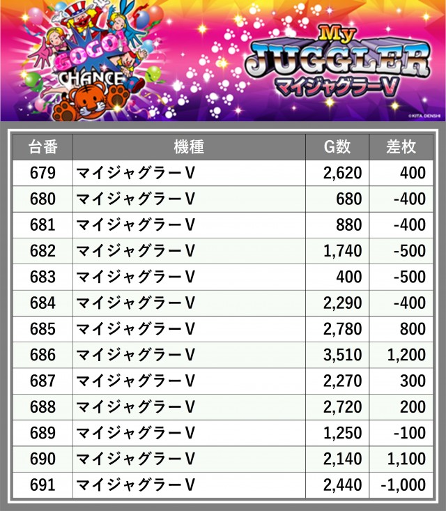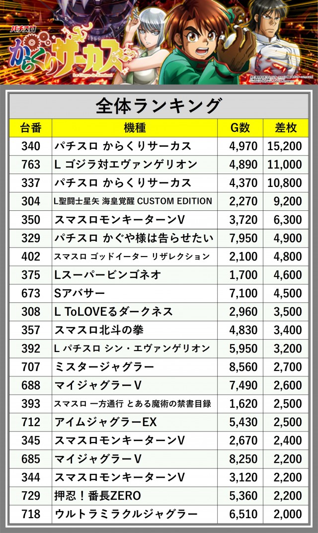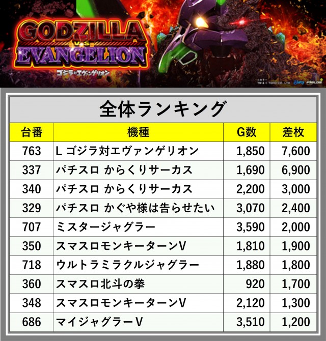 厳選された取材対象機種をはじめ、その他スロット全体から好記録が飛び出した!プレイヤーが楽しんだ1日を下記データにて振り返ってみて欲しい。