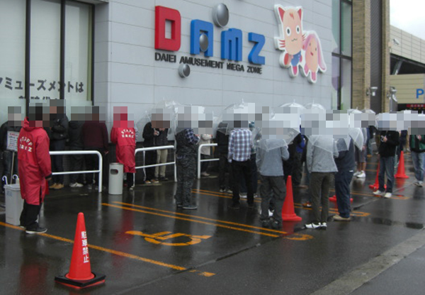 取材当日は雨が降っており、開店を待つプレイヤーに傘を貸し出すスタッフの姿がみられた。スタッフの気配りも、プレイヤーたちが朝から気持ちよく遊技をおこなえているポイントになっていたように思う。