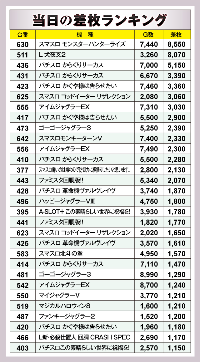 優秀台を見てみると、トップに立ったのは+8,550枚を記録した『スマスロ モンスターハンターライズ』の630番台。まさに大狩猟とも言うべき、素晴らしい成果を見せてくれた。同じく+8,000枚オーバーを達成し、2位となったのが+8,070枚だった『L犬夜叉2』の511番台。こちらも、人気機種としての地位を確立しつつある。このツートップに続いたのが、現在トップクラスの人気を誇る『パチスロ からくりサーカス』で、436番台が+5,150枚、431番台が+3,390枚をそれぞれマークしている。以下、+3,360枚の『パチスロ かぐや様は告らせたい』423番台、+3,060枚の『スマスロ ゴッドイーター リザレクション』625番台、+3,030枚の『アイムジャグラーEX』555番台と続いた。