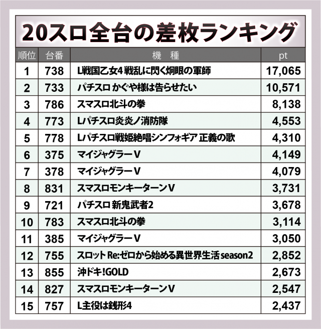 その他では『スマスロ北斗の拳』に+8,100枚超・+3,100枚超が1台ずつ、『Lパチスロ炎炎ノ消防隊』の+4,600枚弱、『Lパチスロ戦姫絶唱シンフォギア 正義の歌』の+4,300枚超、『マイジャグラーⅤ』では+4,100枚周辺×2・+3,100枚弱×1と、スマスロだけでなくジャグラーシリーズも潜在能力をフルに活かした。