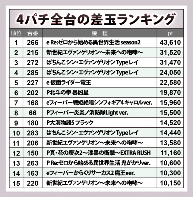 加えて『新世紀エヴァンゲリオン~未来への咆哮~』に+31,500個超・+13,600個弱・+10,200個弱が1台ずつ、『ぱちんこ シン・エヴァンゲリオン Type レイ』に+31,500個弱・+24,000個超・+14,400個超が1台ずつ、『e 仮面ライダー電王』が+22,600個弱、『P北斗の拳 暴凶星』が+19,900個弱、『eフィーバー戦姫絶唱シンフォギア4 キャロルver.』が+16,000個弱と、幅広いラインナップに好調台が輩出されていた。