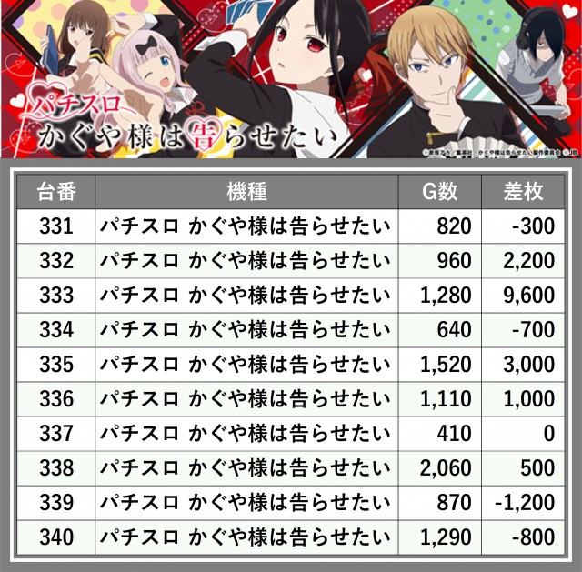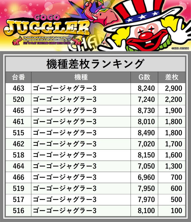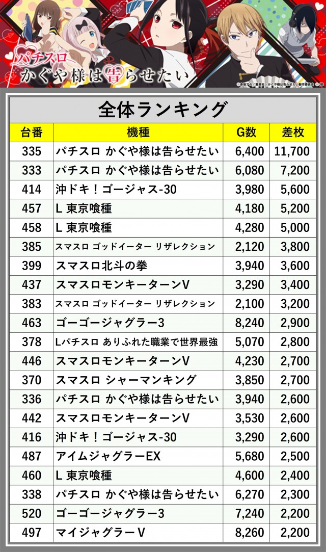 ※差枚数順に掲載しています
