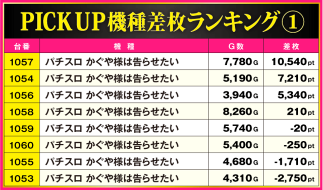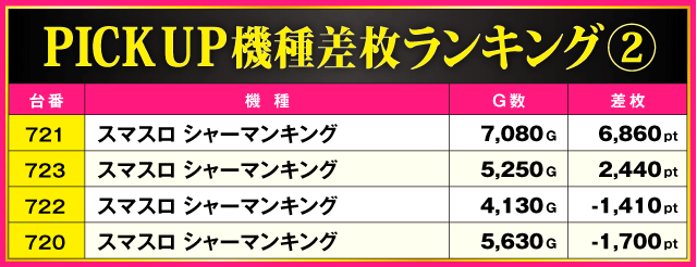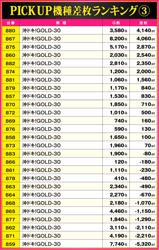 次にPICK UP機種をチェックしてみると、『パチスロ かぐや様は告らせたい』からも万枚超、『スマスロ シャーマンキング』は+6,860ptを記録している。また、『沖ドキ!GOLD-30』は+4,000pt超が2台に+2,000pt超が4台も発生。しかも、半数以上の台がプラス差枚で終了しているだけにシマ内は常に活気に満ち溢れる一日となった。