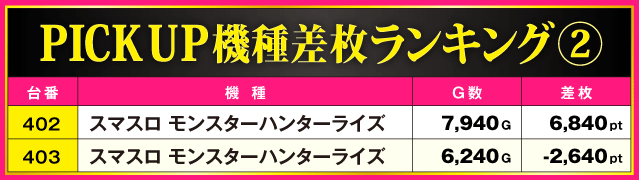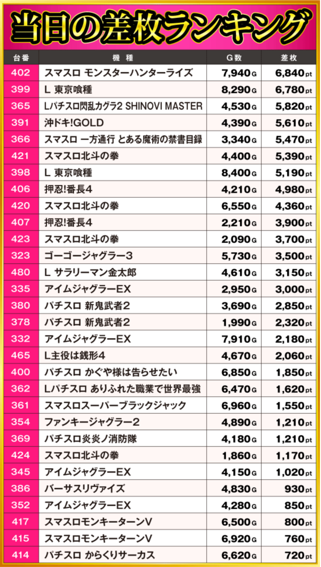 この日は、人気のスマスロを中心に様々な機種で好調台を確認。そんな中、『スマスロ モンスターハンターライズ』が+6,840ptを記録しランキングトップに。次いで、導入直後の新台『L 東京喰種』が僅差の+6,780ptで2位にランクインしている。