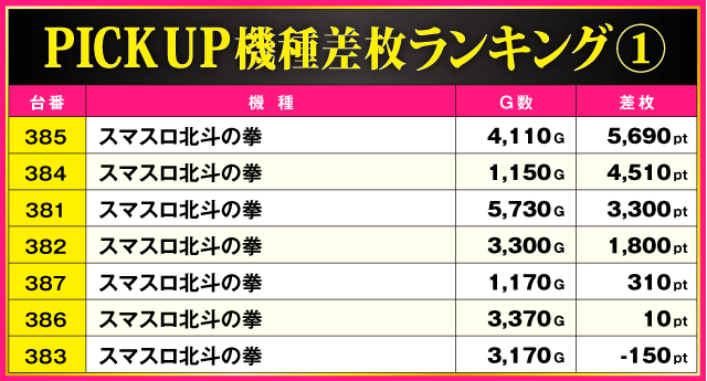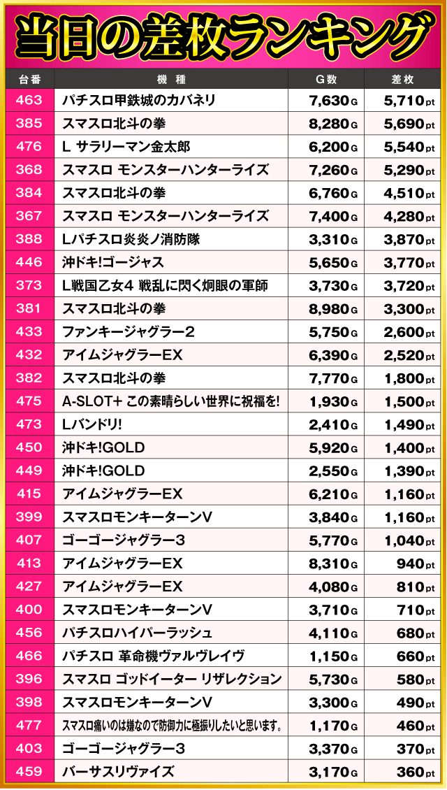 この日は、人気のスマスロを中心に好調台を多数確認。ランキングトップになった『パチスロ甲鉄城のカバネリ』を筆頭に、ありとあらゆる機種で+5,000ptが続出していた。また、ジャグラーシリーズも健闘しており、『ファンキージャグラー2』や『アイムジャグラーEX』、『ゴーゴージャグラー3』が好成績を記録している。