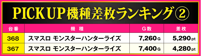 PICK UP機種は2機種。『スマスロ北斗の拳』は385番台の+5,690ptを皮切りに、全7台中6台がプラス差枚で終了する盛況ぶりを見せている。さらに、2台設置の『スマスロ モンスターハンターライズ』は+5,290ptに+4,280ptと、どちらも納得の結果を残しているだけに、プレイヤーにとっては充実の一日となったはずだ。