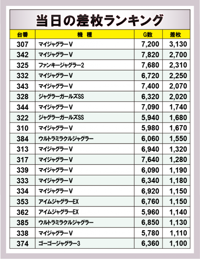 『玉屋409雑餉隈』では、設置台数の多い『マイジャグラーⅤ』『アイムジャグラーEX』『ゴーゴージャグラー3』からまとまった出玉を確保する台を多数確認でき、遊技していたファンはコンスタントなボーナス当選に恍惚の表情を浮かべていたことだろう。