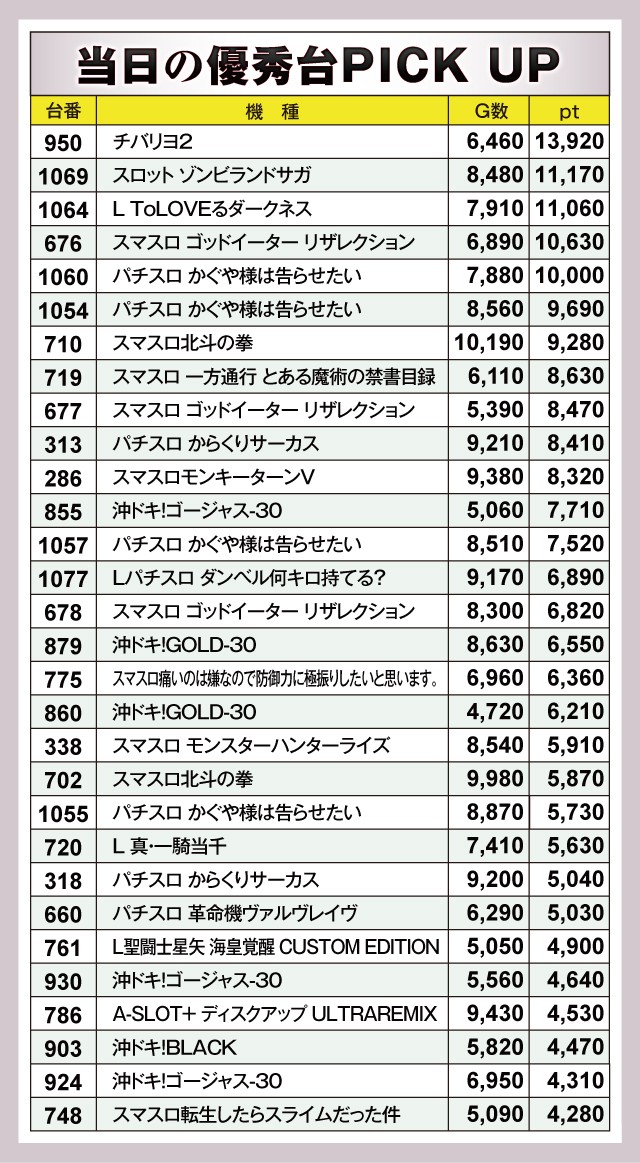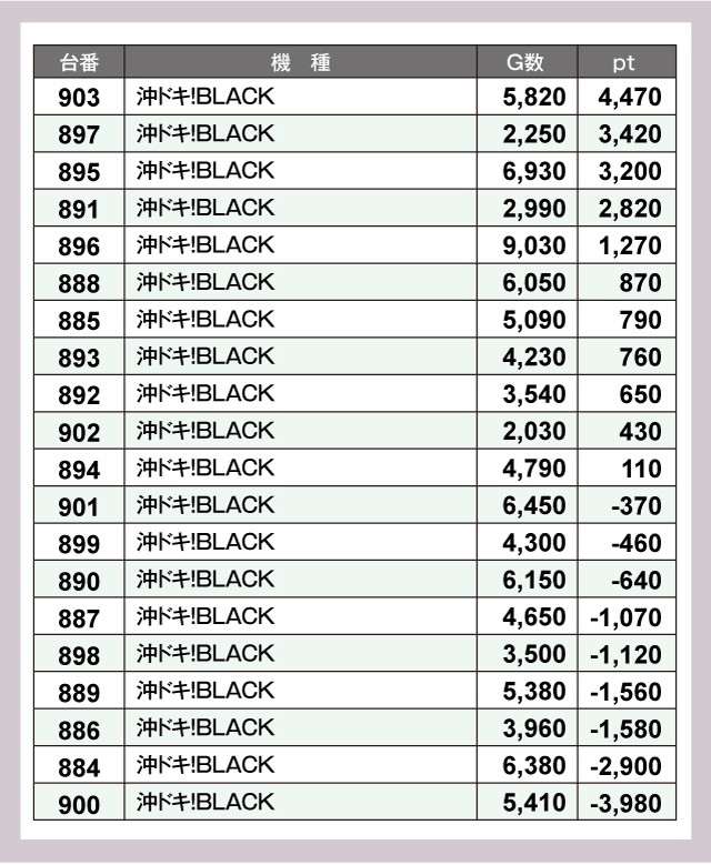 設置台数の多い『沖ドキ!BLACK』は半数以上がプラスと好調で、903番台は+4,470ptと素晴らしい記録を残している。
