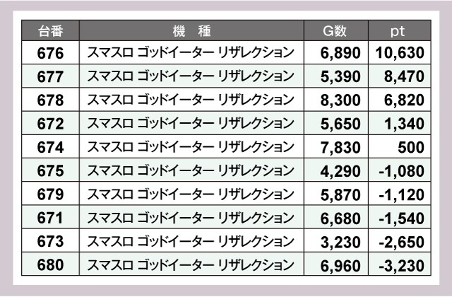 『スマスロ ゴッドイーター リザレクション』は、10台中4台が4桁ptを獲得。なかでも676番台は+10,630ptと圧巻のパフォーマンスを披露している。