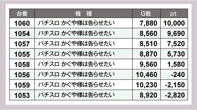 さらに『パチスロ かぐや様は告らせたい』も8台中5台が+1,000ptを超える盛況ぶり。+1万ptオーバーや+9,000ptオーバーが誕生する理想的な展開を迎えていた。