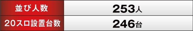 今回は、前回の6倍近くとなる253名ものプレイヤーが開店前から駆けつけていた。果たして当日のスロットコーナーはどんな結果になったのか・・早速見てみよう!