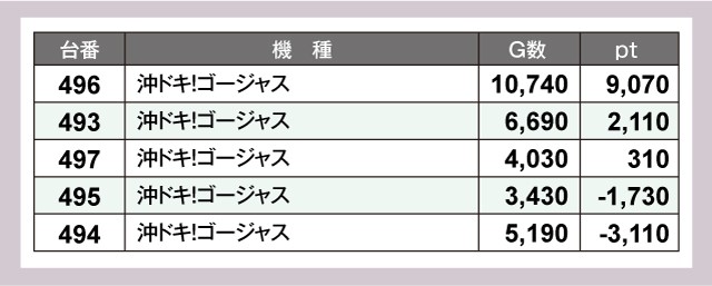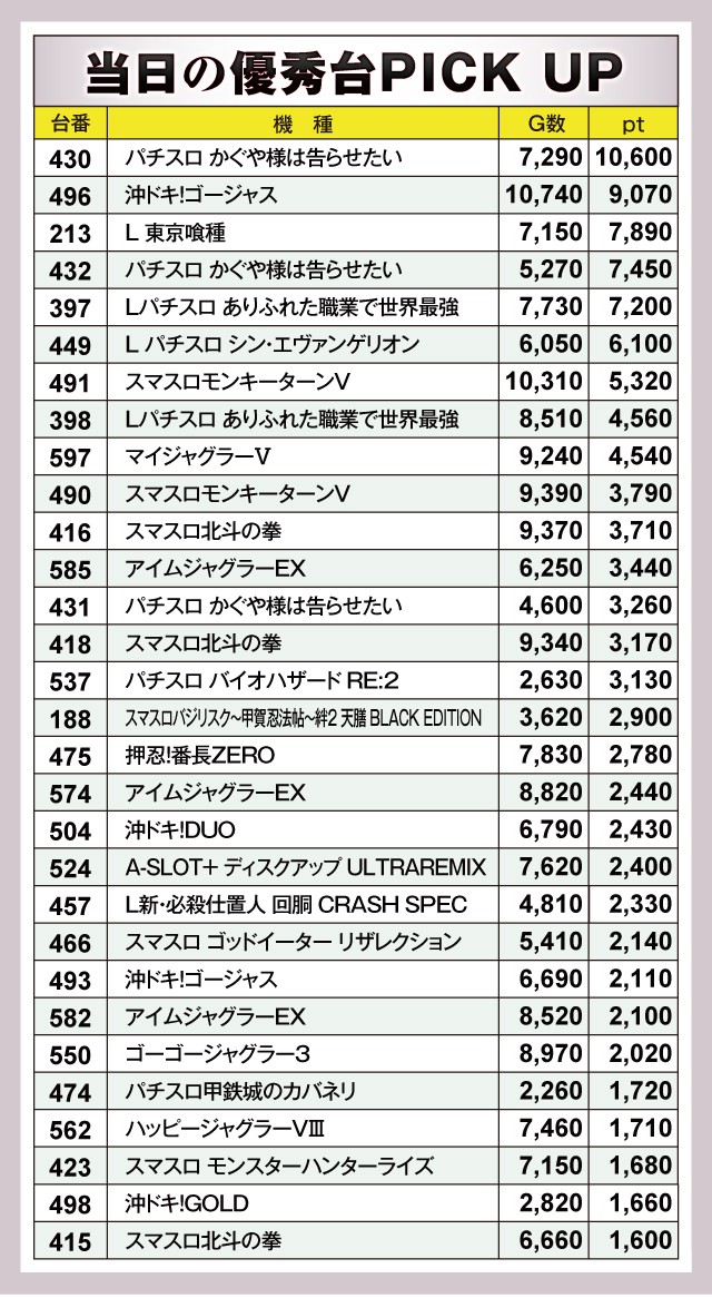 430番台『パチスロ かぐや様は告らせたい』が+1万ptオーバーを達成。次いで496番台『沖ドキ!ゴージャス』+9,070pt、213番台『L 東京喰種』+7,890ptなど見事な活躍で、スロットコーナーの盛り上がりをけん引していた。