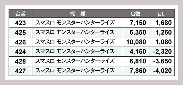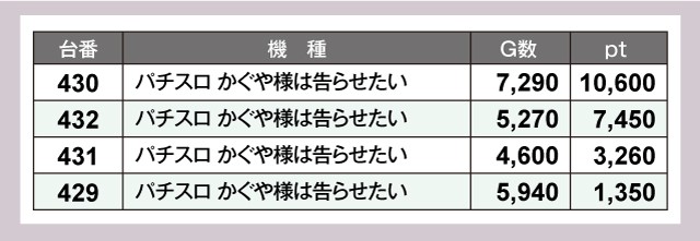 優秀機種の目玉はやはり『パチスロ かぐや様は告らせたい』。430番台の+10,600pt、432番台の+7,450ptなど4台すべてが大量pt獲得という素晴らしい結果を残している。