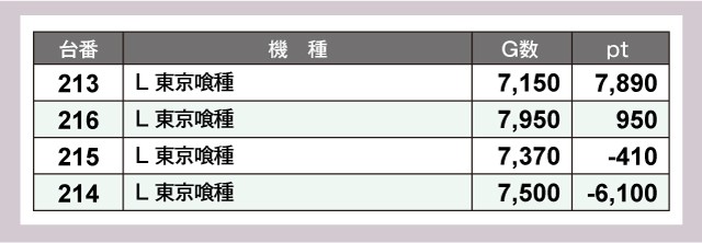 さらに『L 東京喰種』や『沖ドキ!ゴージャス』からは+7,000ptを超える優秀台が誕生しており、周囲の視線を一身に集めていた。