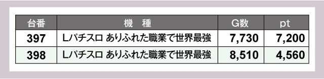 『Lパチスロ ありふれた職業で世界最強』は2台揃って圧巻のパフォーマンスを披露。397番台+7,200pt、398番台+4,560ptと絶好調だった。