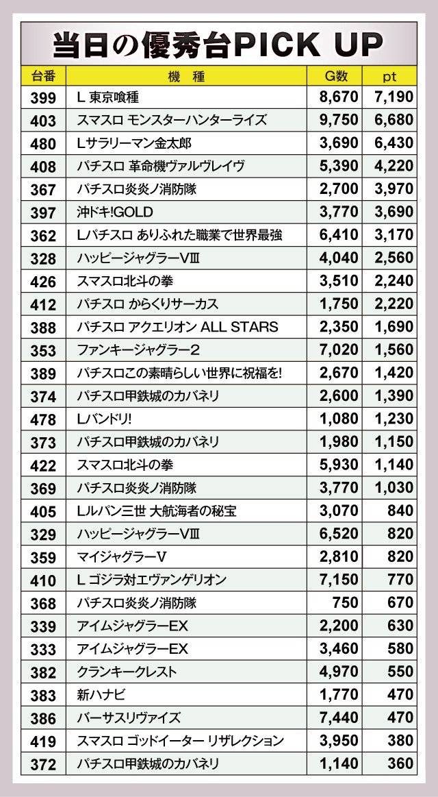 『L 東京喰種』や『スマスロ モンスターハンターライズ』、『Lサラリーマン金太郎』といった人気のスマスロが+5,000ptオーバーを達成し、スロットコーナーを大いに盛り上げていた。
