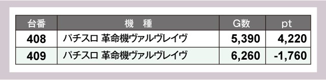 『パチスロ 革命機ヴァルヴレイヴ』も408番台が+4,000ptを超えており、プレイヤーは充実した時間を過ごせていたように思う。
