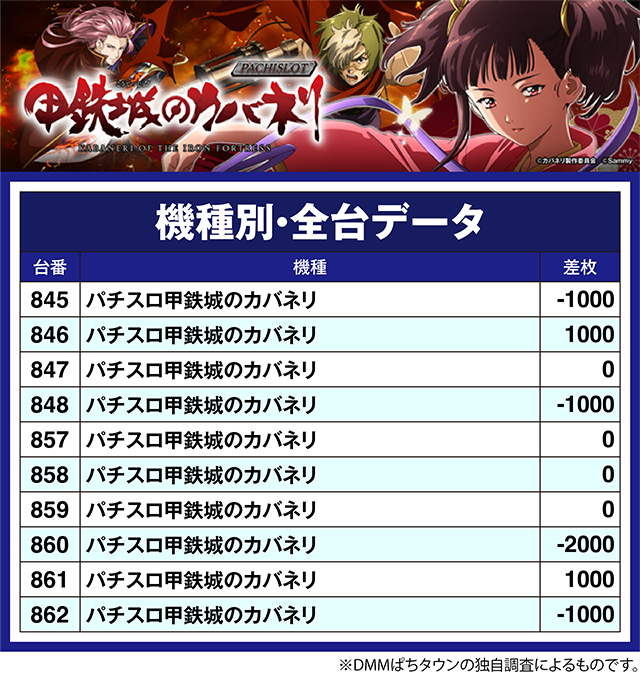 「パチスロ甲鉄城のカバネリ」では、846番台と861番台が1,000ptを記録。