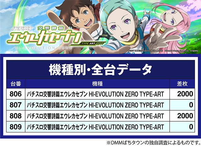 「パチスロ交響詩篇エウレカセブン HI-EVOLUTION ZERO TYPE-ART」の806番台と808番台も2,000ptを記録した。