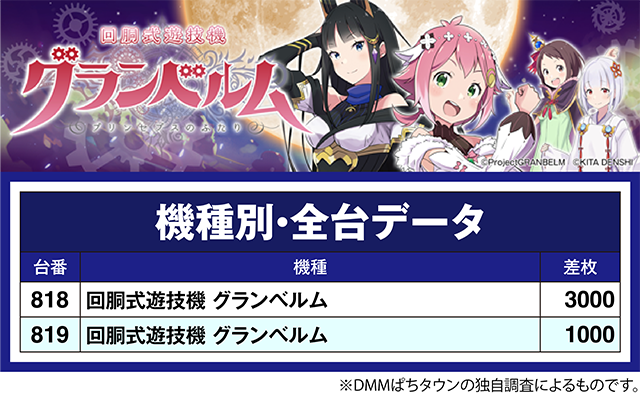 「回胴式遊技機 グランベルム」は設置されている2台のどちらもプラス。818番台は3,000ptとなった。