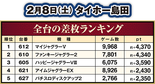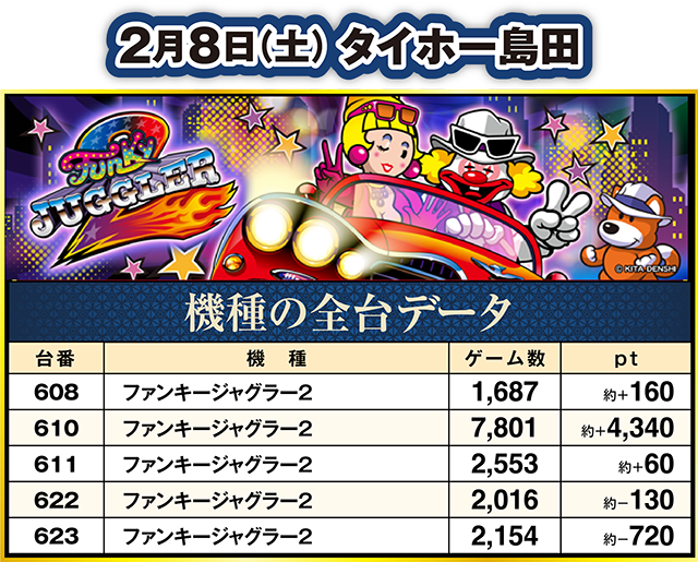 「ファンキージャグラー2」の610番台も約+4,300ptを上回った。