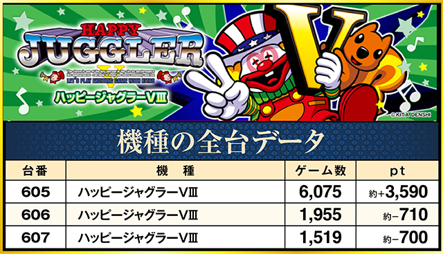 ジャグラーシリーズの各機種が盛り上がりをみせ、「ハッピージャグラーVⅢ」の605番台は約+3,590pt、「アイムジャグラーEX」の621番台も約+2,430ptを記録。