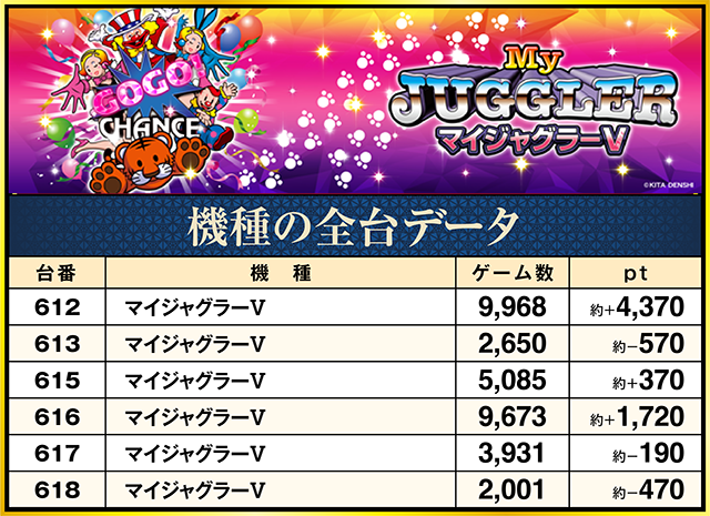 「マイジャグラーⅤ」では、612番台が約+4,300ptオーバー!!