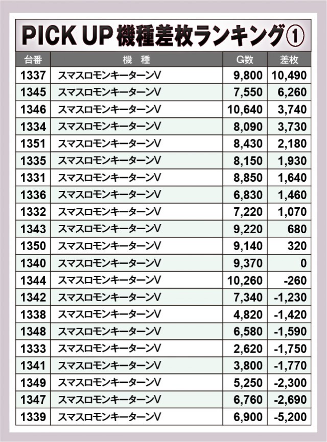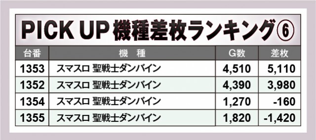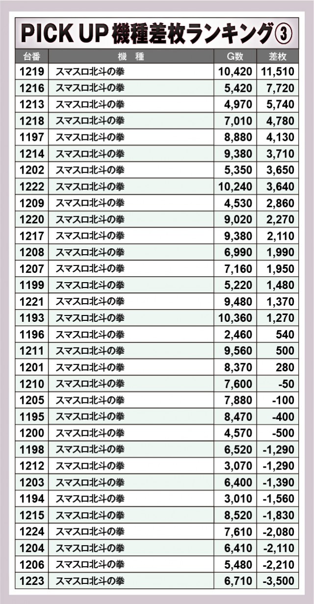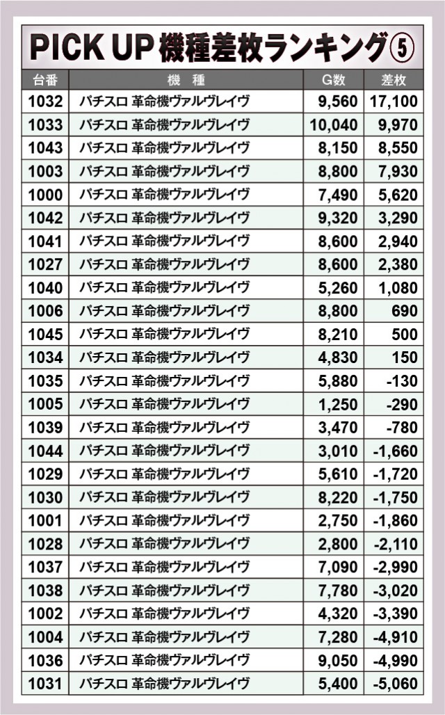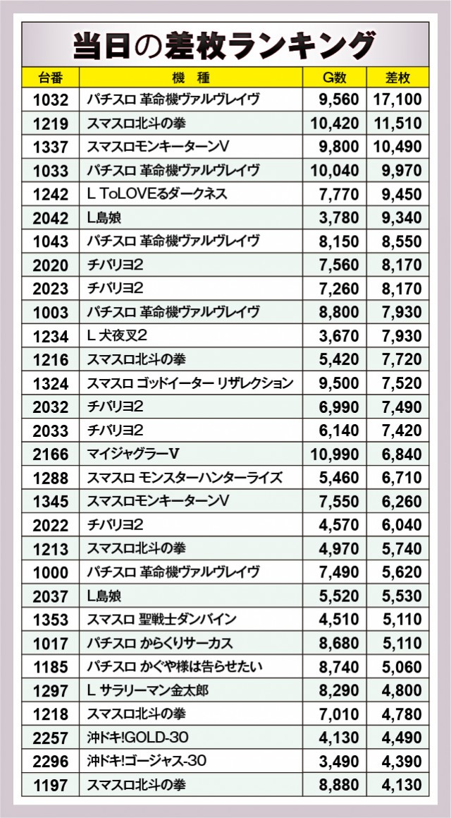 『パチスロ 革命機ヴァルヴレイヴ』『スマスロ北斗の拳』『スマスロモンキーターンV』にて万枚OVERが飛び出し、当日の盛り上がりを象徴する活躍を披露。その後ろにも万枚まであと一歩の台を多く確認でき、新台『L島娘』が大きな熱気を放っていたのも印象的だ。また万回転OVERが複数台確認できる点からも、相当な打ちごたえのある環境だったと窺える。閉店まで力強くレバーを叩いた結果、上表は4,000枚OVERから名を連ねたという事実も納得できるばかりだ。