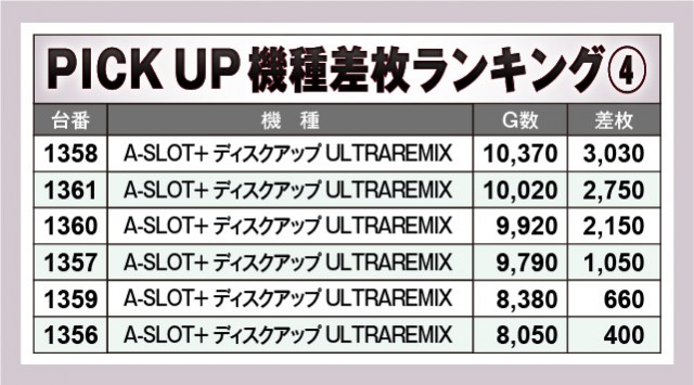 合計8機種がピックアップされた優秀機種は、いずれも半数以上でプラス台を生み出しているのが特徴的である。万枚OVERを達成している点もそうだが、やはり万回転OVERなど打ち込まれた形跡が何よりも鮮烈だ。『チバリヨ2』『沖ドキ!BLACK』『沖ドキ!GOLD-30』ではコンスタントにハイビスカスが輝き、また『A-SLOT+ ディスクアップ ULTRAREMIX』も終日を通してレバーが叩かれており、ファンの満足度が高いエリアとなっていた。