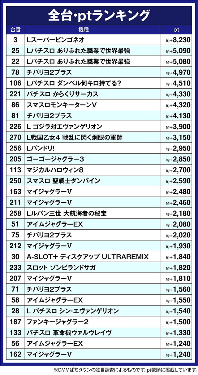 最新機種の「Lパチスロ ありふれた職業で世界最強」は、25番台と22番台が約+5,000pt以上となった。