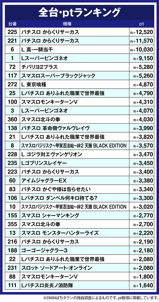 最新機種である「スマスロスーパーブラックジャック」の117番台と「L 東京喰種」の272番台、「Lパチスロ ありふれた職業で世界最強」の25番台も、約+4,700pt以上となった。
