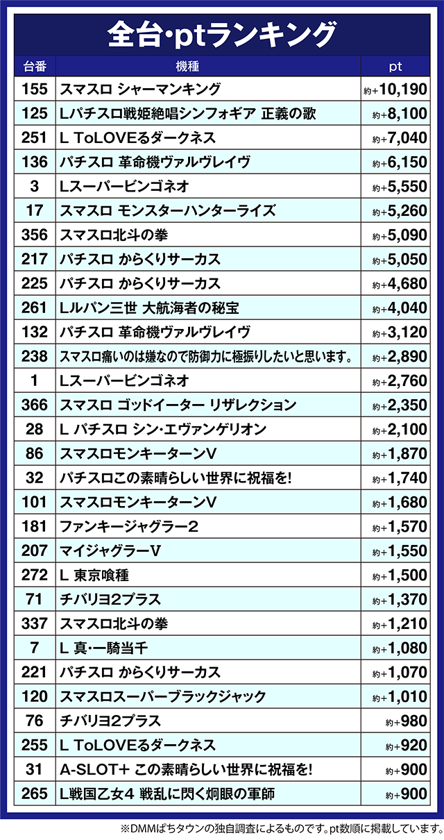 ほかにも、「パチスロ 革命機ヴァルヴレイヴ」の136番台が約+6,150pt、「スマスロ モンスターハンターライズ」の17番台は約+5,260ptと、多くの台が結果を残した。