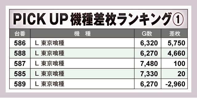 今回のPICK UP機種はSANKYO系、沖ドキシリーズ、バラエティ、最新台というスタイルで展開されたが、全てにおいて半数以上の台がプラス差枚で終了するという見事な結果を残している点はまさに圧巻である。また、最新台の『L 東京喰種』からは+5,750枚が飛び出しており、早くもそのポテンシャルの高さを披露していた。