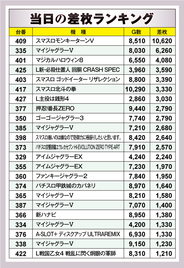当日の差枚ランキングを見てみると、『スマスロモンキーターンV』が万枚オーバーを達成! ホール内の盛り上がりをリードする存在となっていた。また『マイジャグラーⅤ』からは6,000枚オーバー、『マジカルハロウィン8』では4,000枚オーバーを記録。安定感抜群の機種ながら突出した出玉を披露し、膨大な熱気を放っていた。