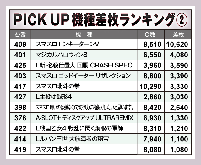 『マイジャグラーV』では、設置26台中15台がプラス差枚を記録! その他の『ジャグラーシリーズ』も含めゲーム数もしっかりと回されており、多くのファンがしっかりと確信を持って遊技していたことがわかる。さらにその光景はバラエティコーナーでも見ることができ、『L新・必殺仕置人 回胴 CRASH SPEC』や『スマスロ ゴッドイーター リザレクション』などの設置台数1台の機種が大活躍! 差枚3,000枚オーバーを記録する台が続出し、遊技していたファンは存分に実力を発揮する各機種の盛り上がりに、喜びの表情を浮かべていた。