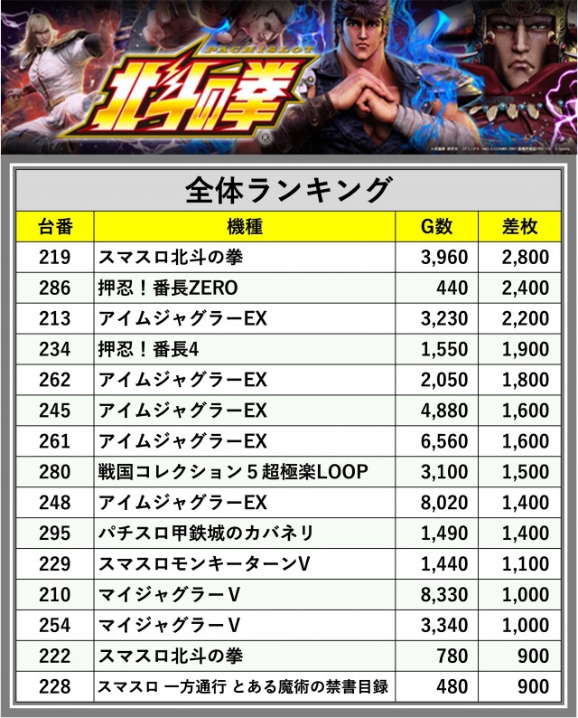 厳選された取材対象機種をはじめ、その他スロット全体から好記録が飛び出した!プレイヤーが楽しんだ1日を下記データにて振り返ってみて欲しい。