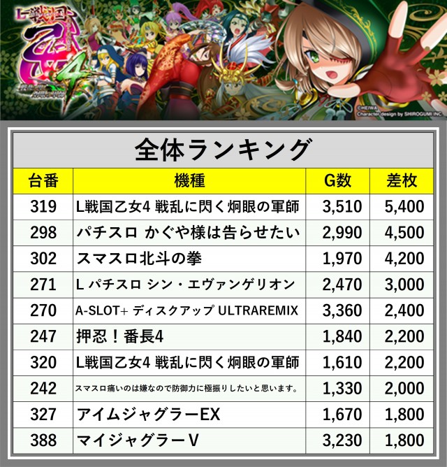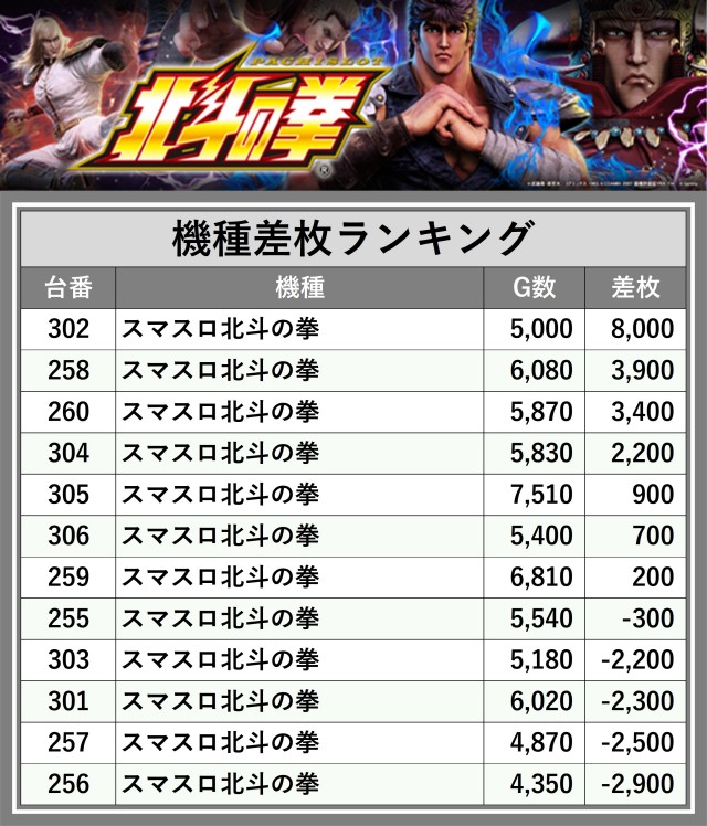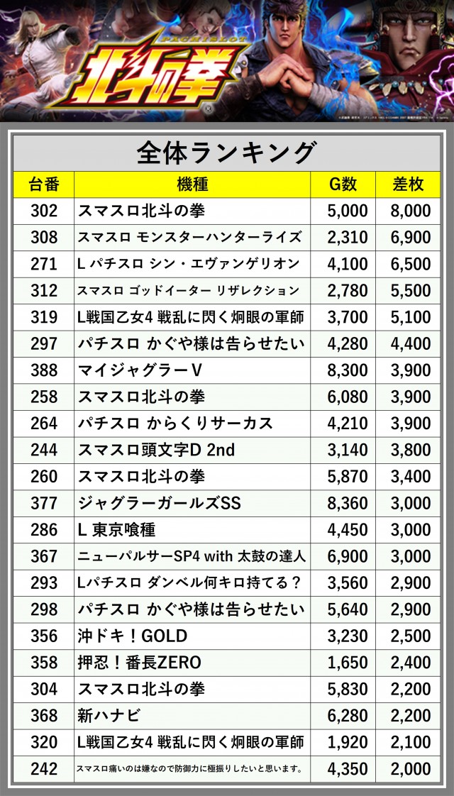 ※差枚数順に掲載しています