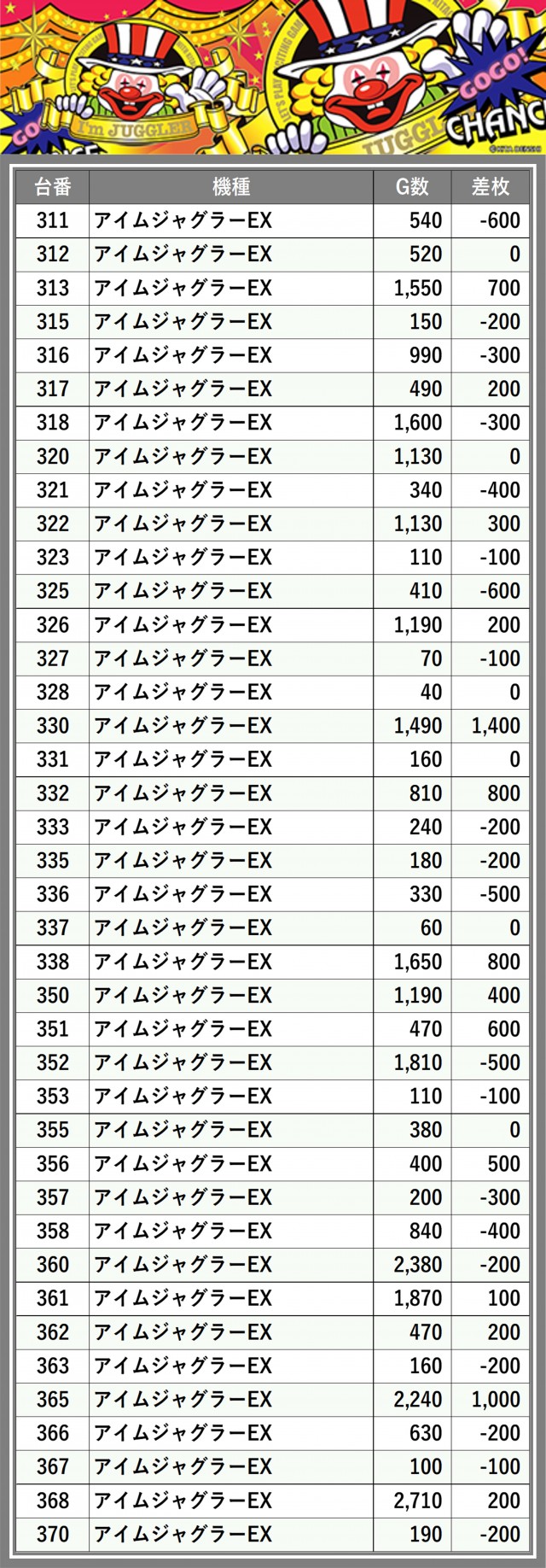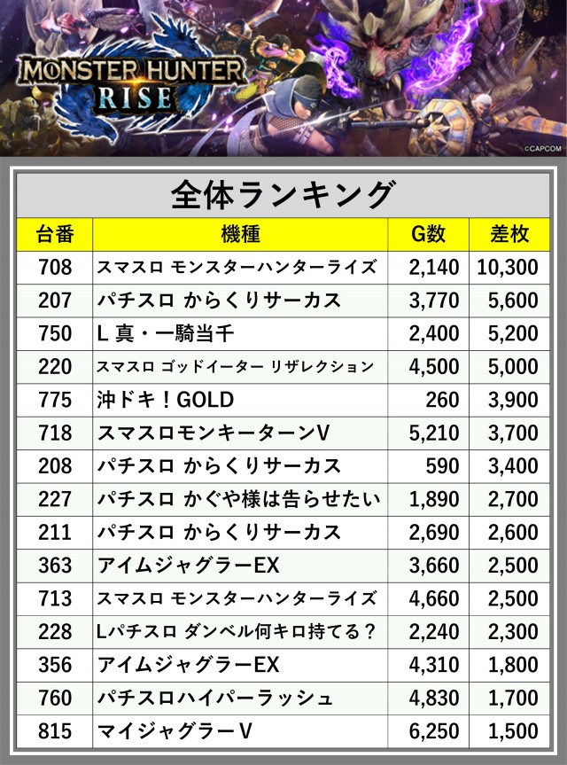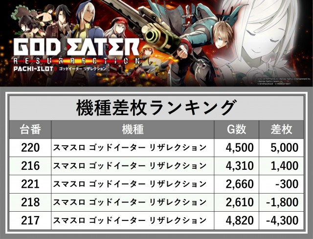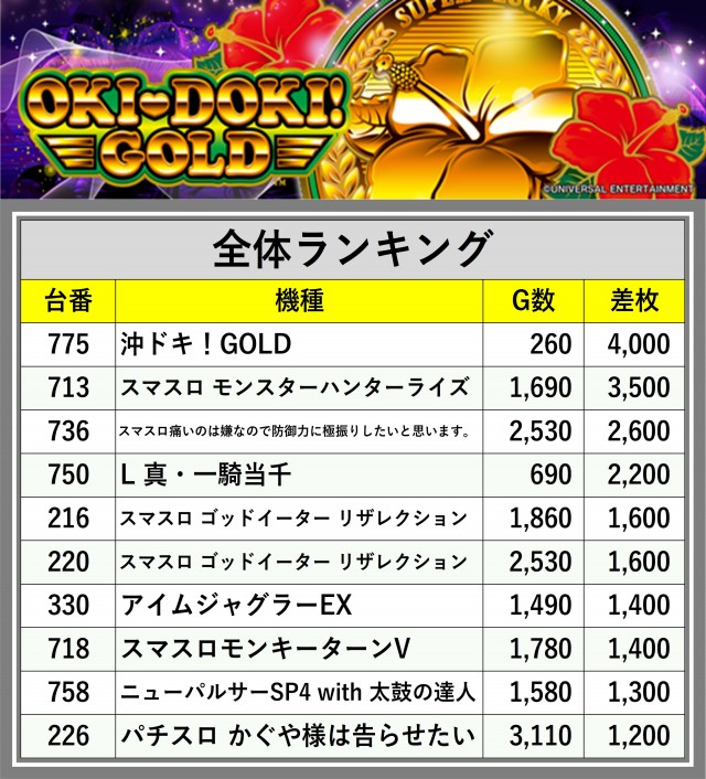 厳選された取材対象機種をはじめ、その他スロット全体から好記録が飛び出した!プレイヤーが楽しんだ1日を下記データにて振り返ってみて欲しい。