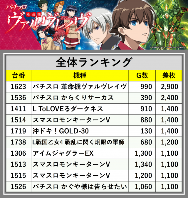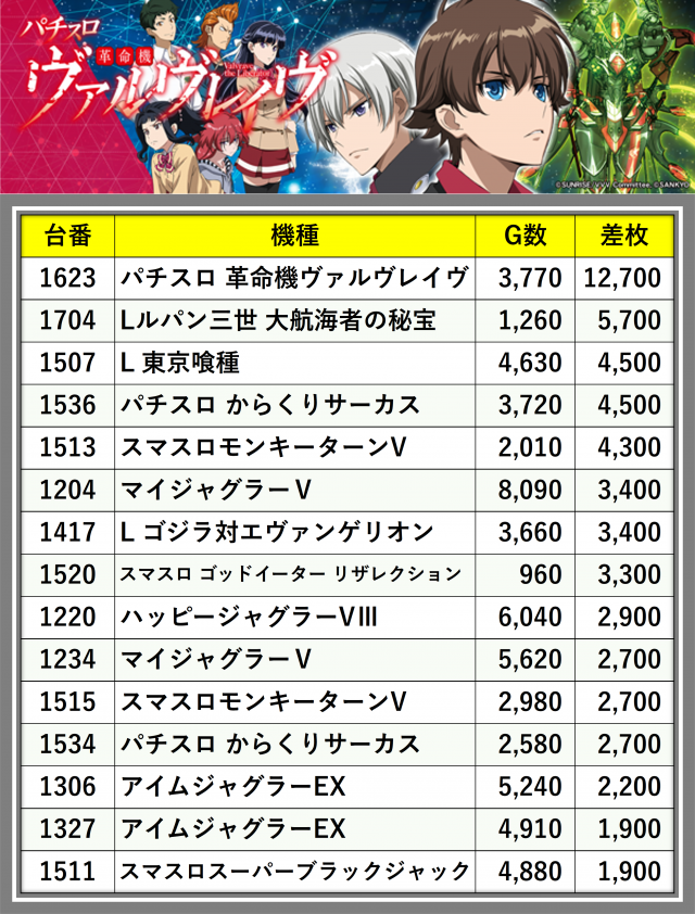 ※差枚数順に掲載しています